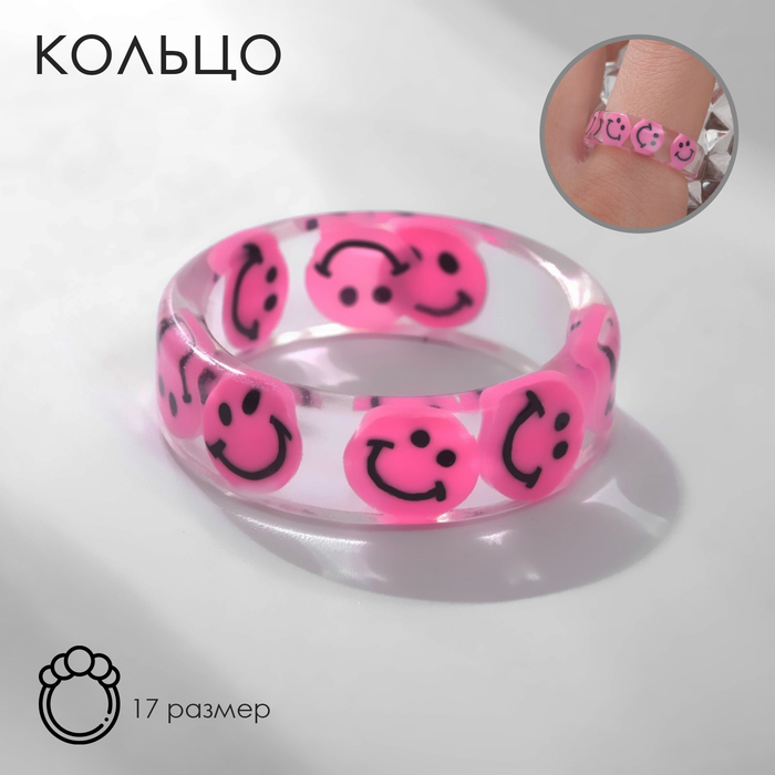 Кольцо «Прозрачное» смайлики, цвет розовый, 17 размер