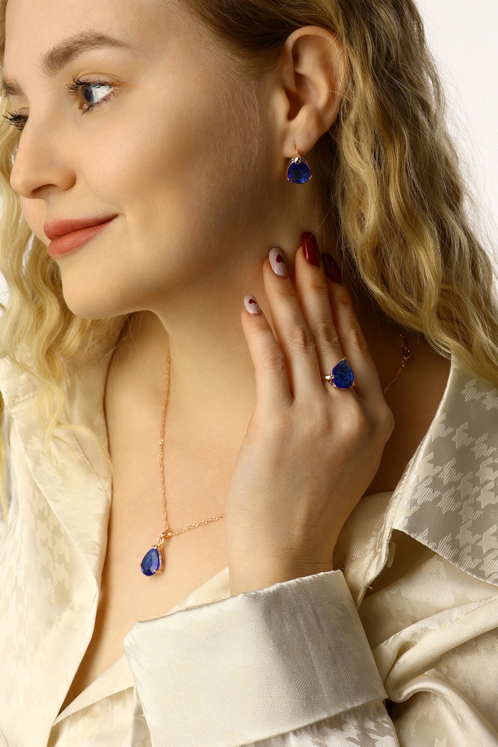 Гарнитур 3 предмета: серьги, кулон, кольцо безразмерное «Эдель» капля, цвет синий в золоте, 45 см