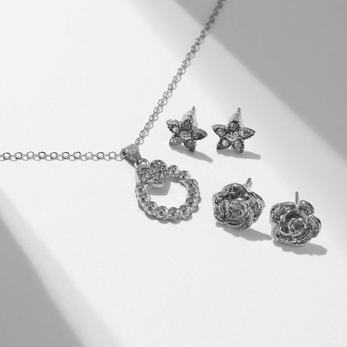 Гарнитур 3 предмета: серьги (2 пары), кулон «Цветочный Гарнитур», цвет белый в серебре, 45 см