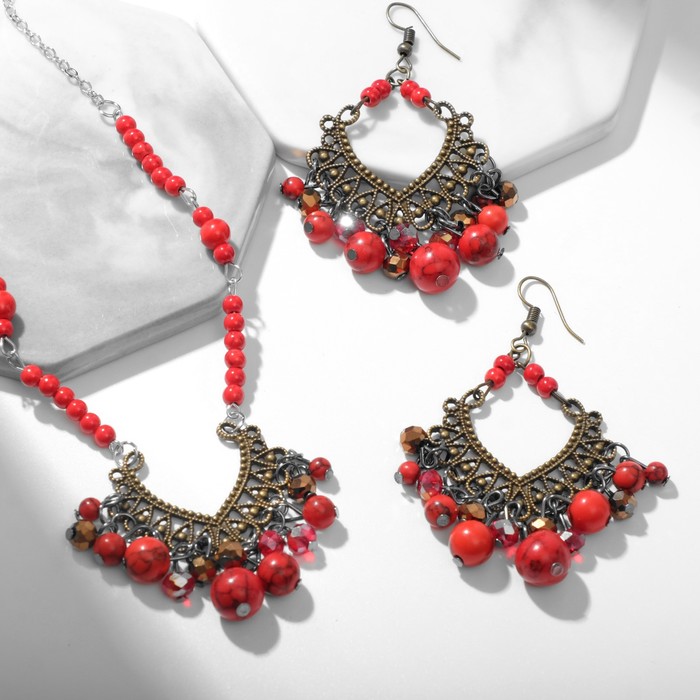 Набор 2 предмета: серьги, колье «Индия», красный в чернёном серебре, 32 см
