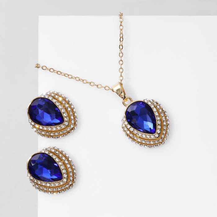 Гарнитур 3 предмета: серьги, кулон, кольцо безразмерное «Эдель» капля, цвет синий в золоте, 45 см