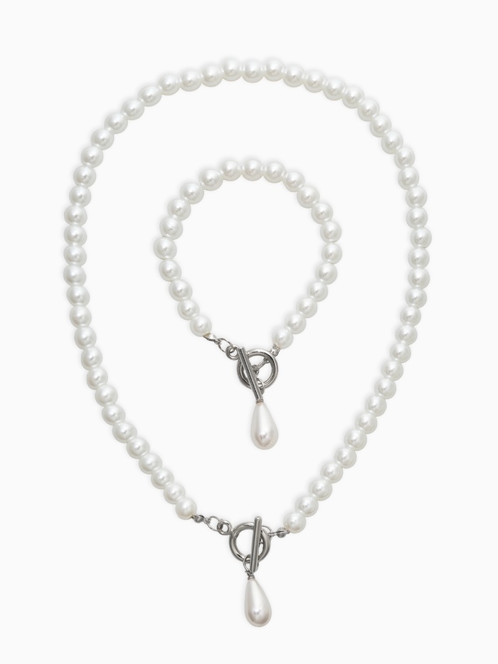 Набор 2 пред-та: бусы.браслет "Жемчуг", капелька, цвет белый в серебре L=18/42см №8
