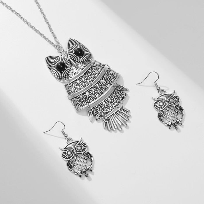Гарнитур 2 предмета: кулон, серьги «Сова», цвет чернёное серебро, 60 см