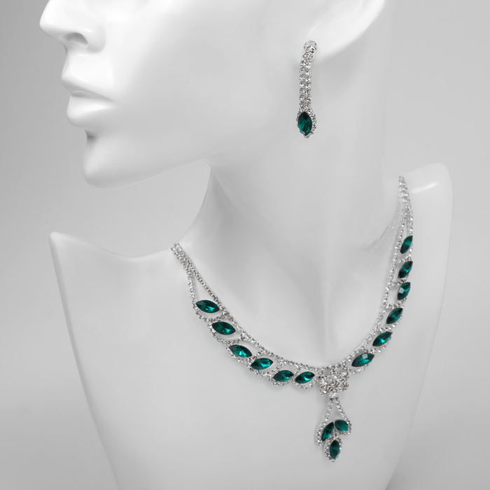 Набор 2 предмета: серьги, колье «Листопад» ромб, цвет изумрудно-белый в серебре, 45 см