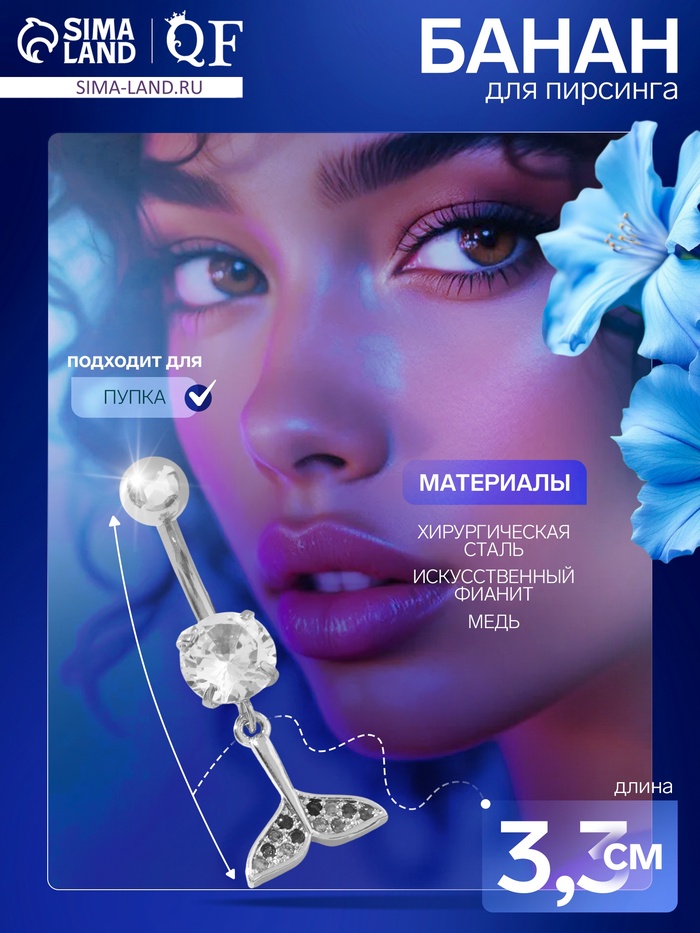 Пирсинг в пупок «Хвост» кита, штанга L=1 см, белый в серебре