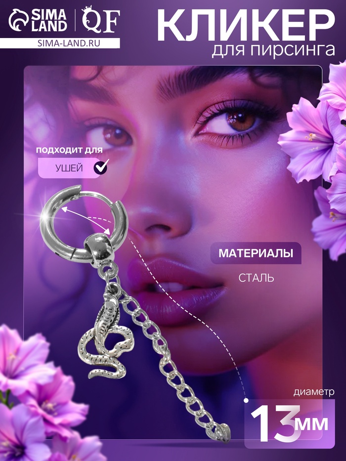 Пирсинг в ухо «Кольцо» змея с цепью, d=13 мм, цвет серебро