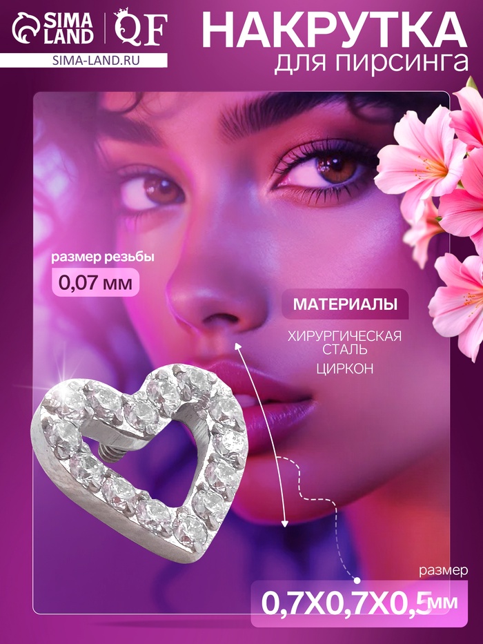 Накрутка для пирсинга из нержавеющей стали «Сердце», белая в серебре, резьба 0.07 мм