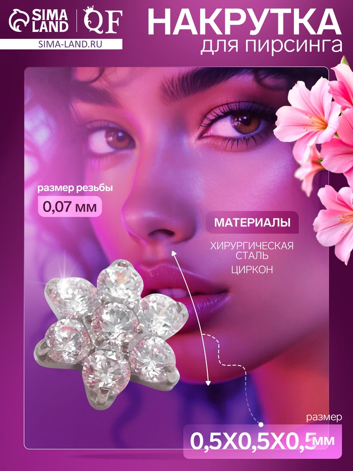 Накрутка для пирсинга из нержавеющей стали «Цветок», белая в серебре, резьба 0.07 мм