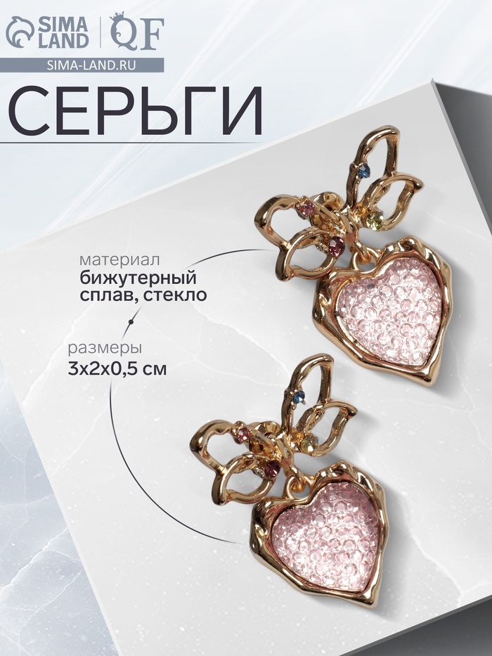 Серьги металл «Сердечки» розовая вставка, цвет золото