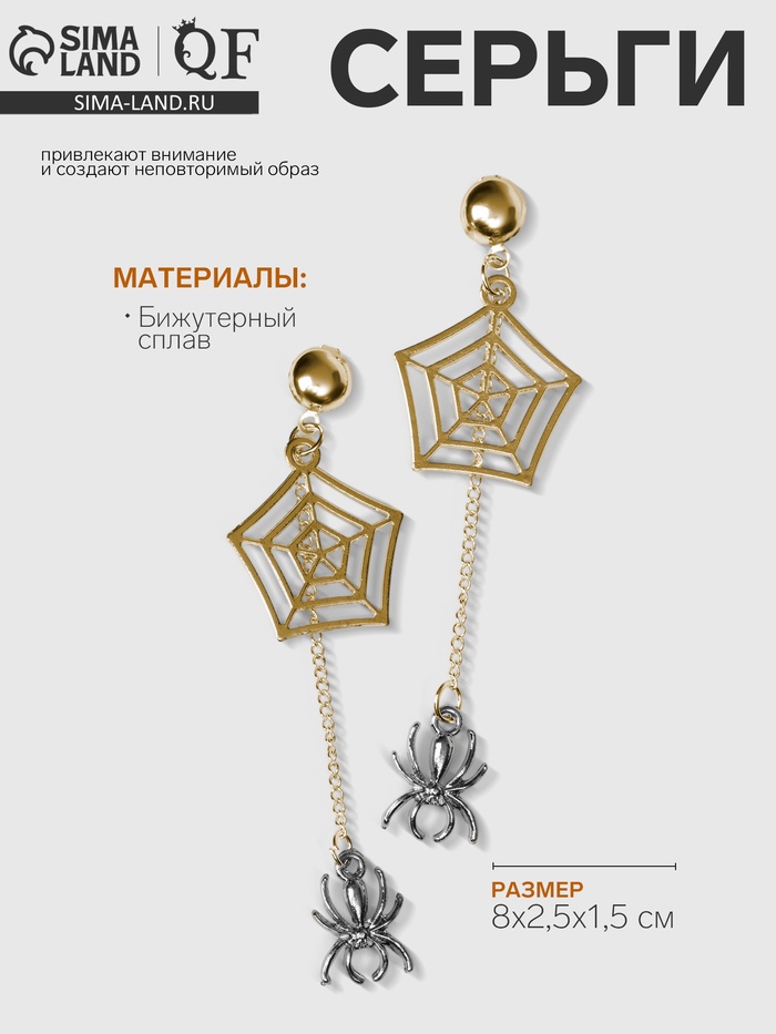 Серьги висячие «Пауки» с паутиной, цвет серый в золоте, 8 см