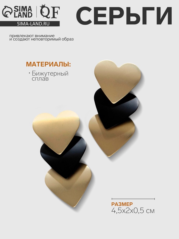 Серьги металл «Тренд» сердечки, цвет чёрно-золотой