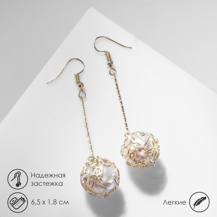 Серьги висячие «Шар плетёный», цвет белый в золоте, 6,5 см