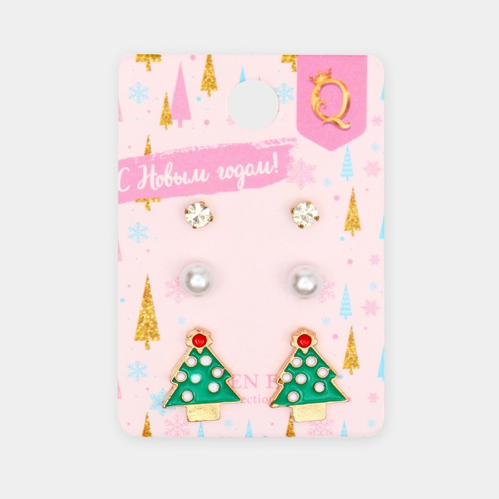 Серьги пусеты QF «Новогодние», 3 пары, ёлочка, цветные