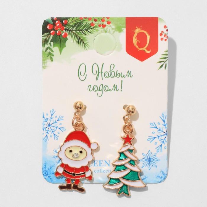 Серьги висячие «Новогодние» ёлочка и санта, цветные в золоте