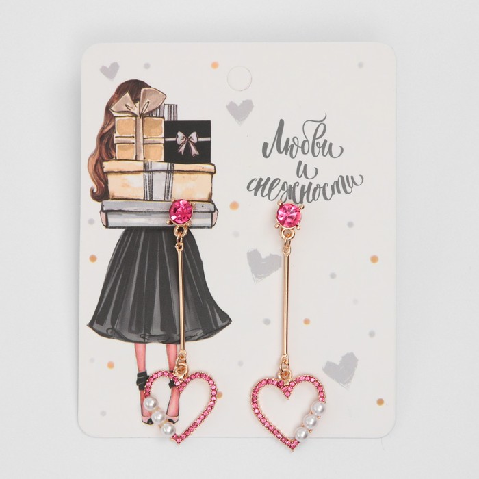 Серьги висячие со стразами «Сердце» с жемчужинами, цветные в золоте