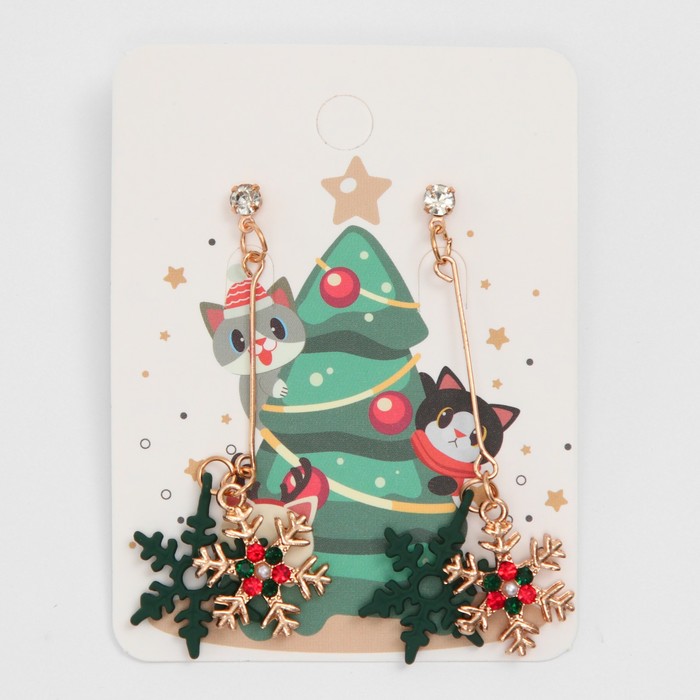 Серьги висячие со стразами «Новогодние» снежинки, цвет красно-зелёный в золоте