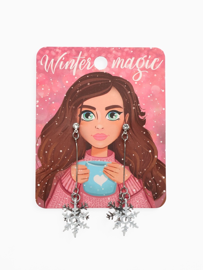 Серьги висячие со стразами «Новогодние» две снежинки, бело-голубые в серебре