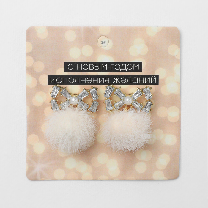 Серьги висячие со стразами «Новогодние» пушистый бант, белый в золоте