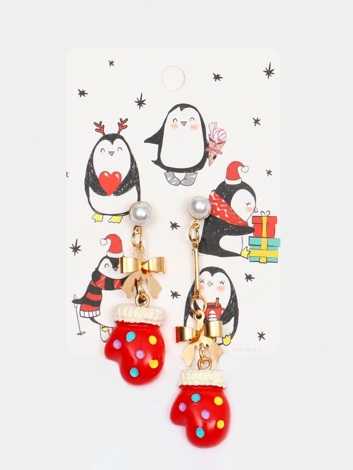Серьги висячие «Новогодние» варежки, цвет красно-белый в золоте