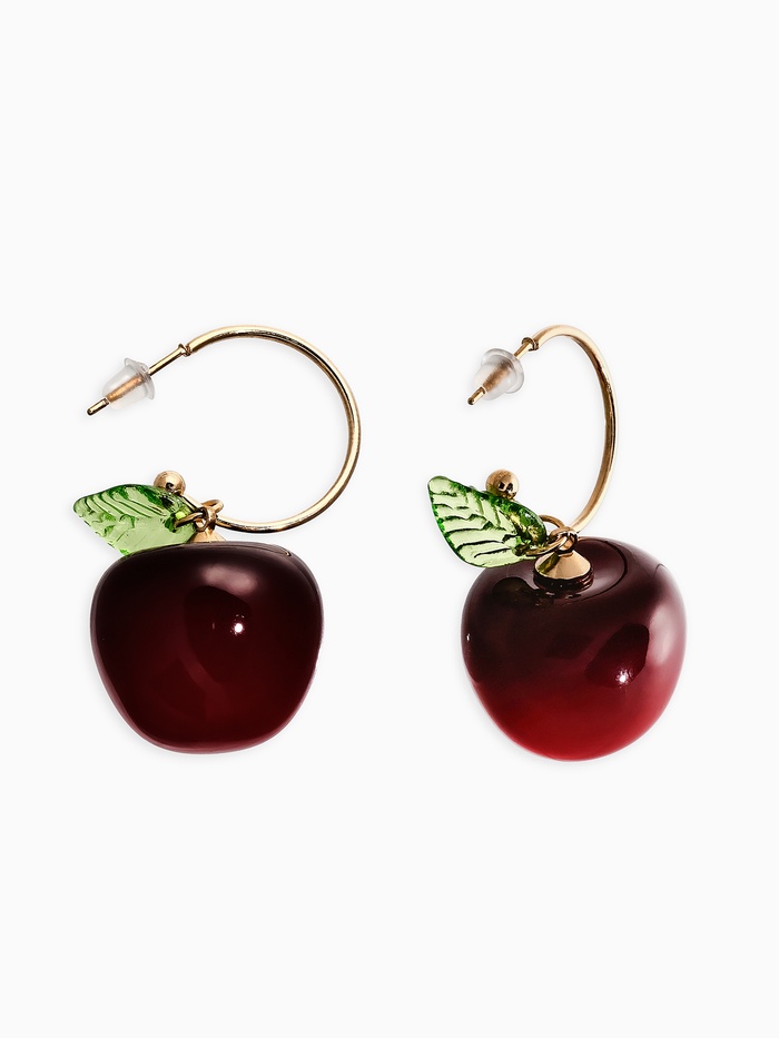 Серьги-кольца «Черешня с листочком», бордовые в золоте