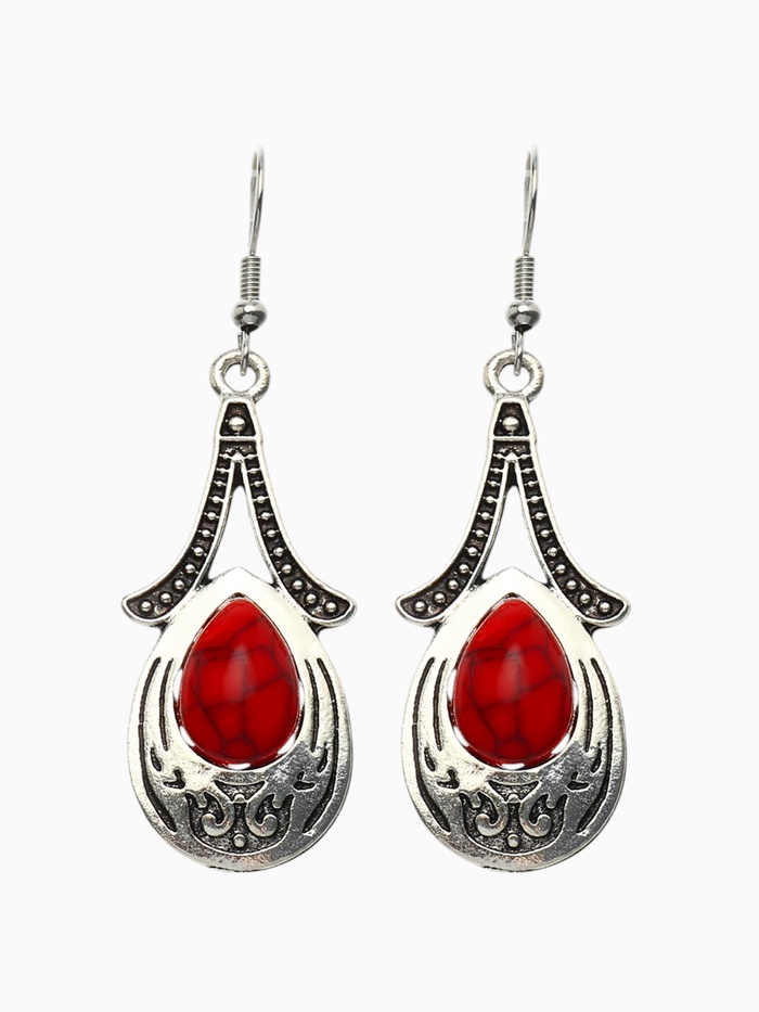 Серьги под натуральный камень «Этника» объёмная капля, красные в чернёном серебре