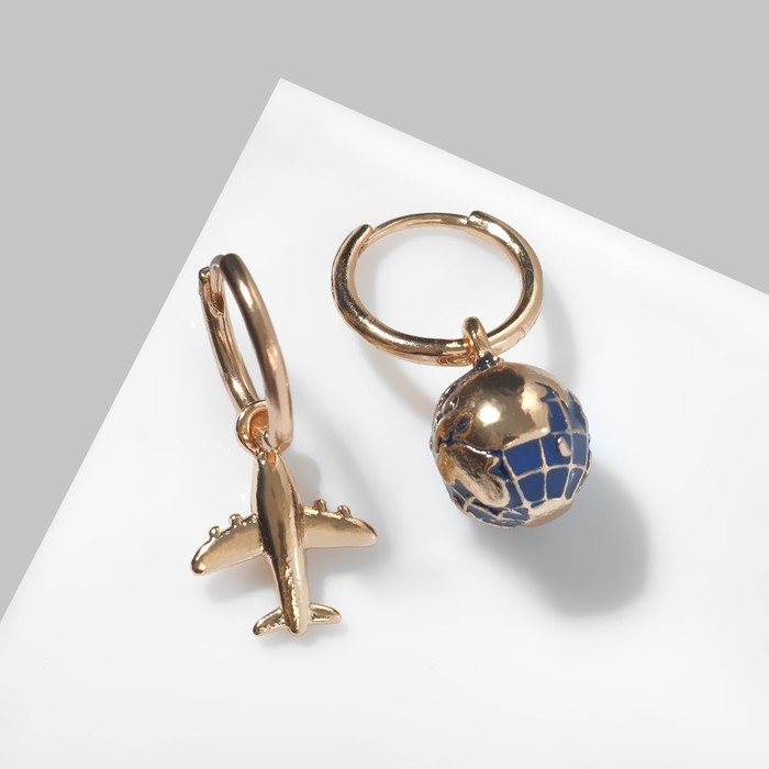 Серьги конго с подвесками «Брелок», с эмалью, самолет и планета, синие в золоте