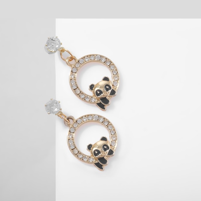 Серьги с эмалью «Панды» на кольцах, цвет чёрно-белый в золоте