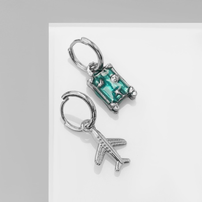 Серьги с эмалью «Брелок» самолет и чемодан, цвет голубой в серебре