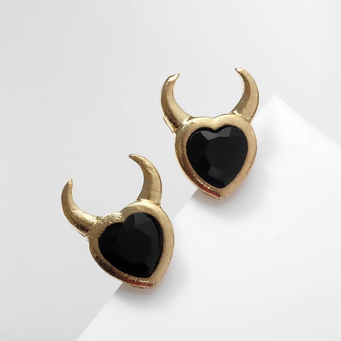Серьги с эмалью «Дьяволёнок» сердце, цвет чёрный в золоте