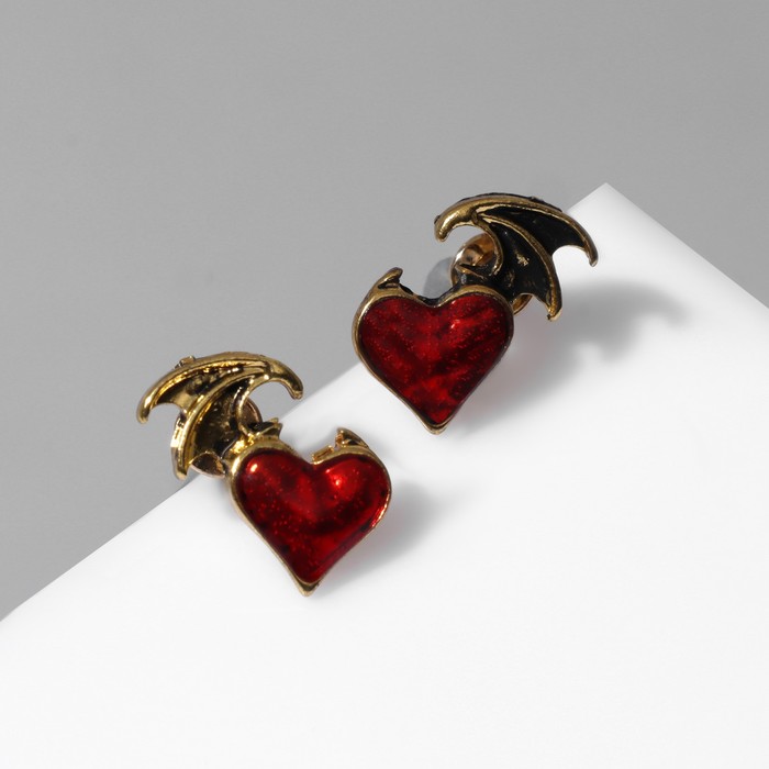 Серьги с эмалью «Дьяволёнок» сердце, цвет красный в чернёном золоте