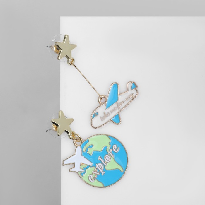 Серьги с эмалью «Вокруг света» самолёт и земной шар, цветные в золоте