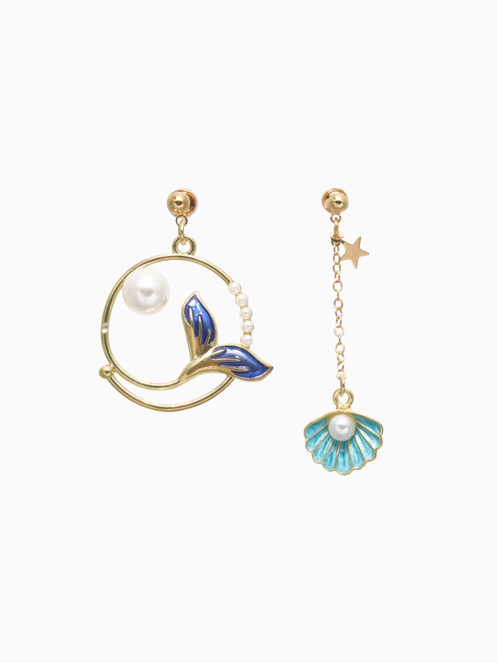 Серьги с эмалью «Ночь» хвост с ракушкой, цвет сине-белый в золоте