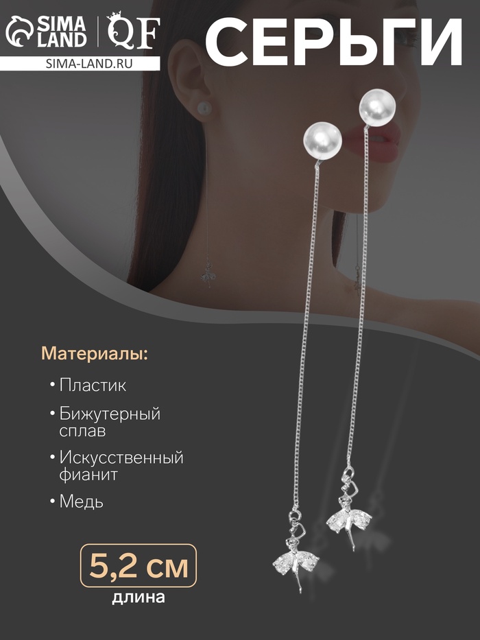 Серьги с жемчугом «Цепочки» балерина и бусина, цвет белый в серебре, шар №10