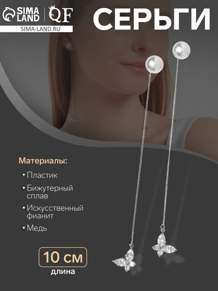 Серьги с жемчугом «Цепочки» бабочка и бусина, цвет белый в серебре, шар №10