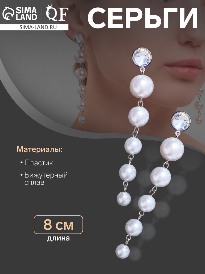Серьги с жемчугом «Висячие» страза в огранке, цвет белый в серебре, 8 см