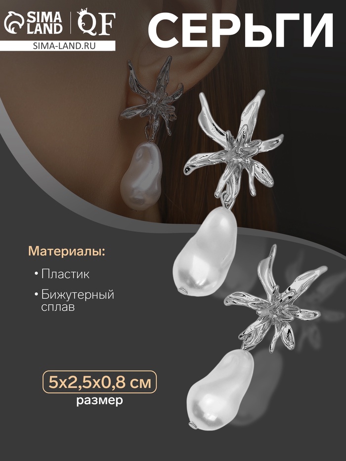 Серьги с жемчугом «Бусина» груша с цветком, цвет серебро