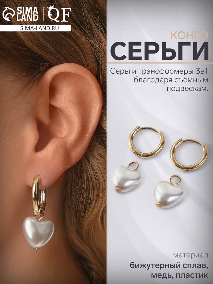 Серьги со съёмным элементом «Трансформер» сердечко жемчужное, цвет белый в золоте