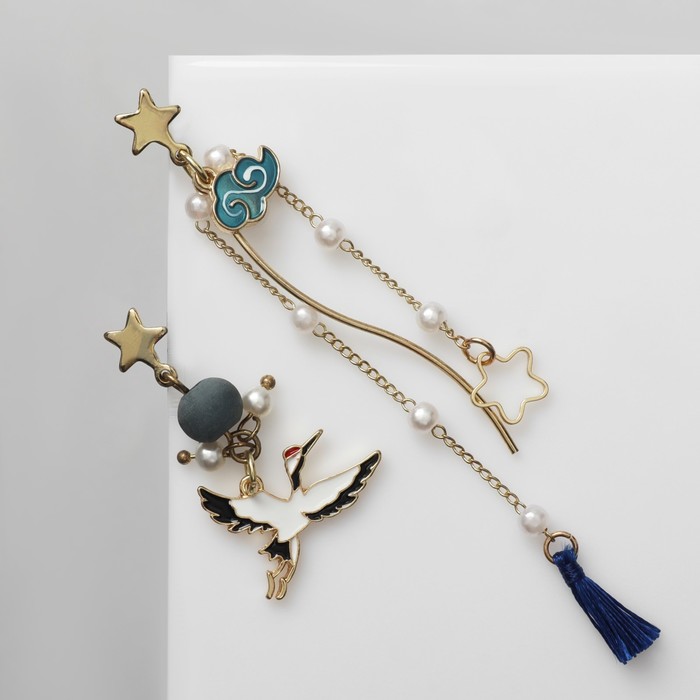 Серьги с жемчугом «Япония» аист и звёзды, цветные в золоте