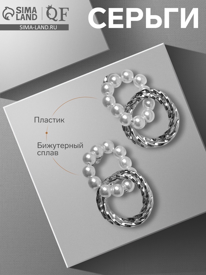 Серьги с жемчугом «Два кольца» бусины и металл, цвет серебро