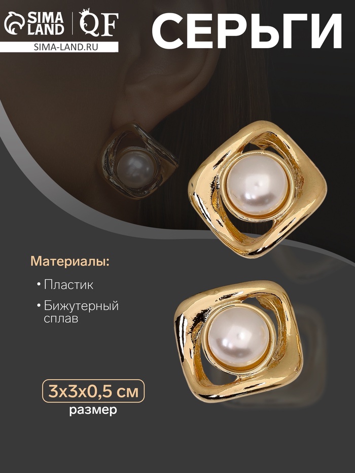 Серьги с жемчугом «Эксклюзив» мятый квадрат, цвет золото