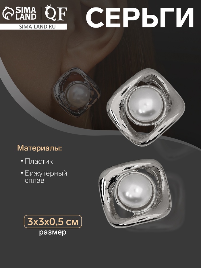 Серьги с жемчугом «Эксклюзив» мятый квадрат, цвет серебро