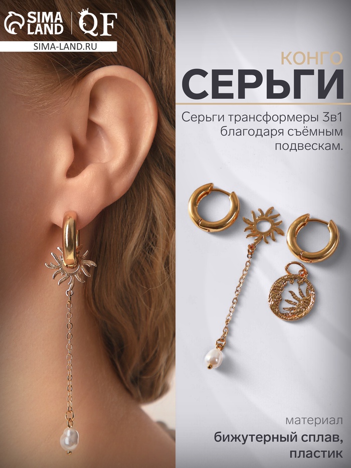 Серьги со съёмным элементом «Трансформер» солнце, цвет белый в золоте