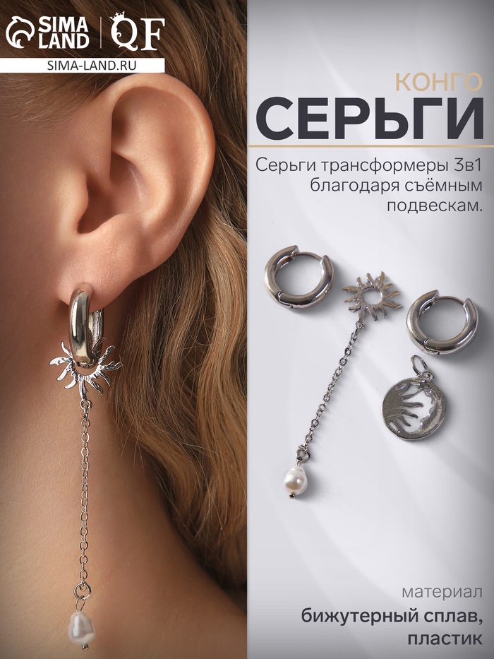 Серьги со съёмным элементом «Трансформер» солнце, цвет белый в серебре