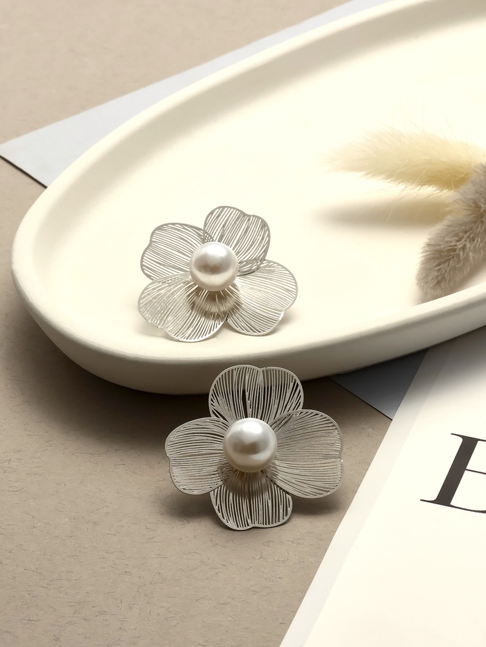 Серьги с жемчугом «Цветы» крупные, белые в серебре