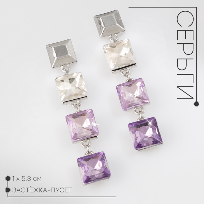 Серьги со стразами «Блум» квадраты тёмные, цветные в серебре