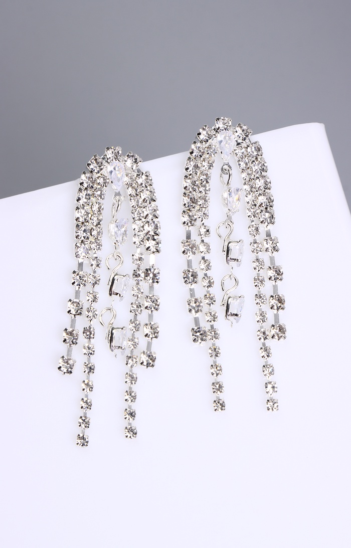 Серьги висячие со стразами «Водопад» гроздь, белые в серебре