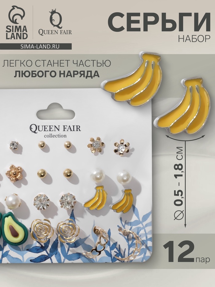 Серьги пусеты QF «Вкусняшки и цветочки»,12 пар, цветные в золоте
