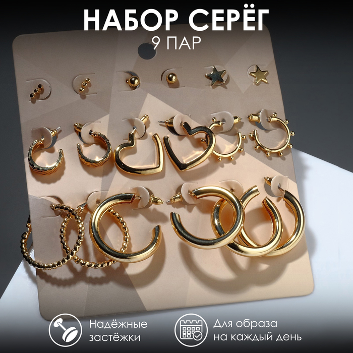 Серьги-кольца набор 9 пар «Звёзды» рисунок, цвет золото, d=3