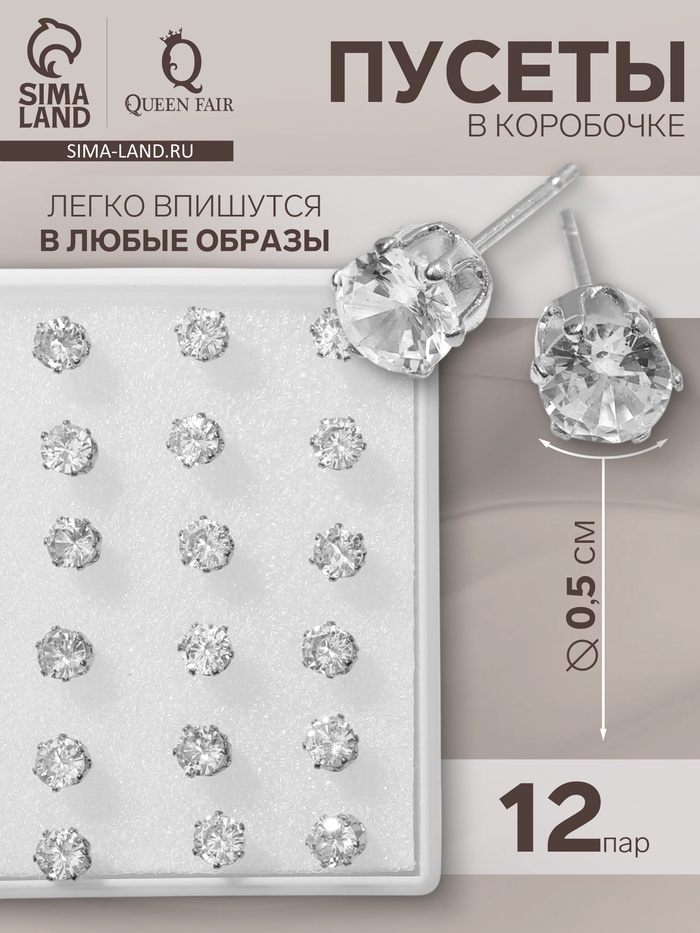 Серьги пусеты в коробочке QF «Гвоздики», 12 пар, белые в серебре