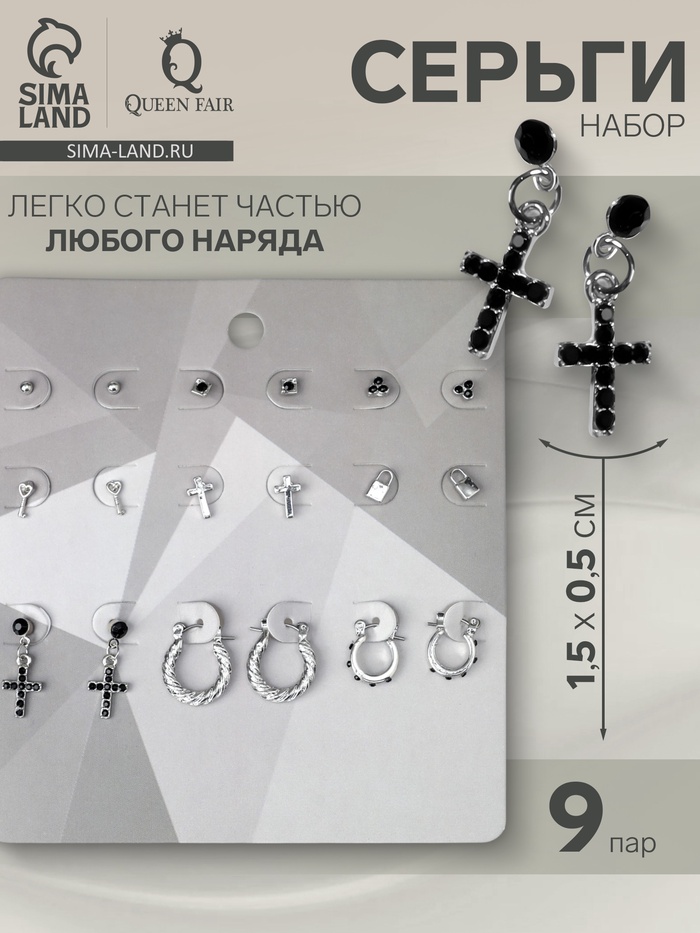 Набор серег QF «Крестики», 9 пар, кольца, цвет чёрный в серебре